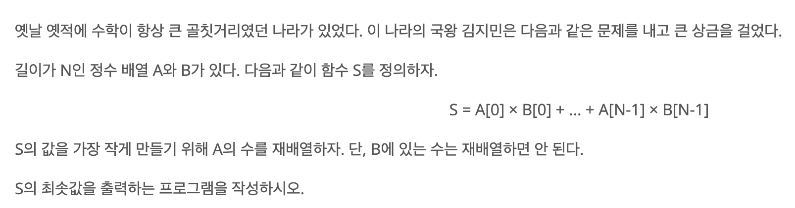 S는 A 배열과 B 배열을 곱연산한 것이다. 이때 A 배열을 재배열하여 S의 최소값을 출력하면 된다.